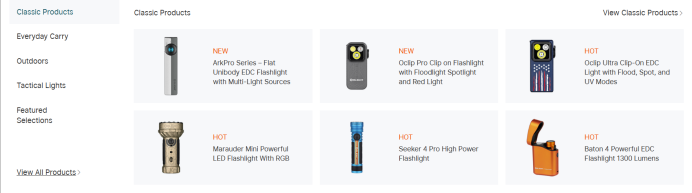 从单一手电筒到户外头灯、自行车灯、氛围灯等照明设备,智能电池充电仓、充电线及配件等充电设备以及电池充电盒、支架、手绳等周边配套产品,覆盖日常、户外、骑行、战术照明等多元场景,满足各类受众不同照明需求。