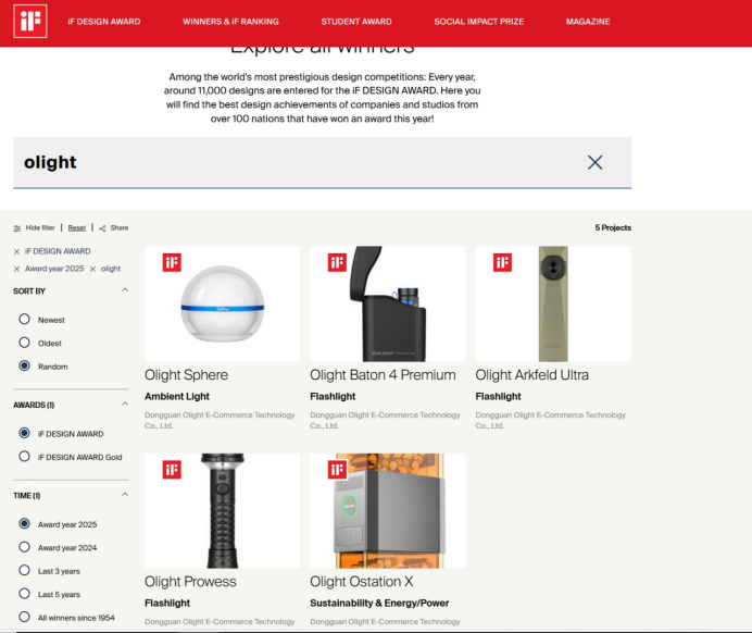 2025 年,Olight 旗下的便携 EDC 手电套装、双向照明手电、智控小夜灯、三光合一 EDC 时尚手电等产品再度斩获德国iF设计大奖。