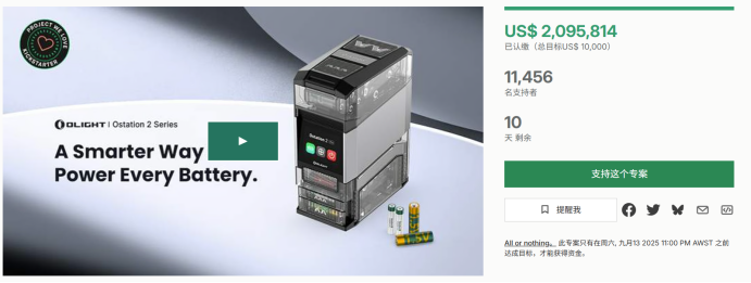 2025 年,Olight Ostation 2 智能电池管理设备单价为 139 美元起,在 Kickstarter 发布众筹信息后,截至 9 月 3 日,该产品获得 11456 名支持者,筹到 209.58 万美元,超出众筹目标 41034.72%。