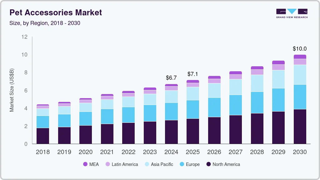 GRAND VIEW RESEARCH 数据显示,2024 年全球宠物配件市场规模估计为 67.1 亿美元,预计到 2030 年将达到 99.7 亿美元,2025 年至 2030 年的复合年增长率为 6.9%。