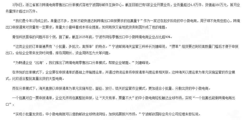 2026 年 3 月初,随着一批包含 1.1 万余件衣帽鞋服、日用百货的包裹在宁波国际邮件互换中心顺利验放启运,浙江省首个跨境电商零售出口“分单模式”正式宣告落地。