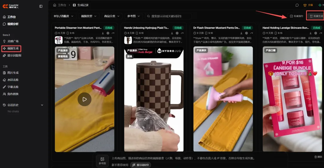 灵感广场为客户通过CreatOK生成的相关视频,可以找到客户的关键词跟商品图,然后点击可以查看生成效果。