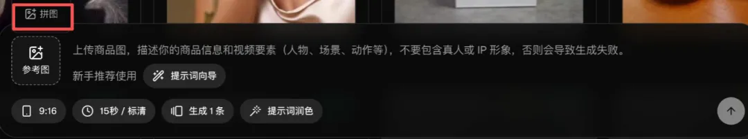 2、拼图按钮是需要我们上传我们产品图让ai去更好的理解我们产品的模型样子,最佳的为三视图:正面图、侧面图、俯视图。图片是2D的,视频展示是3D的,所以拼图功能对模型独特化的客户最为重要。