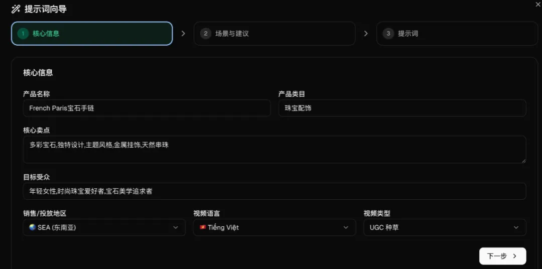 当我们输入图片后点击框内提示词向导功能会出现我们的核心信息ai会识别我们的产品内容类目,进而去找到一些核心卖点,目标受众。