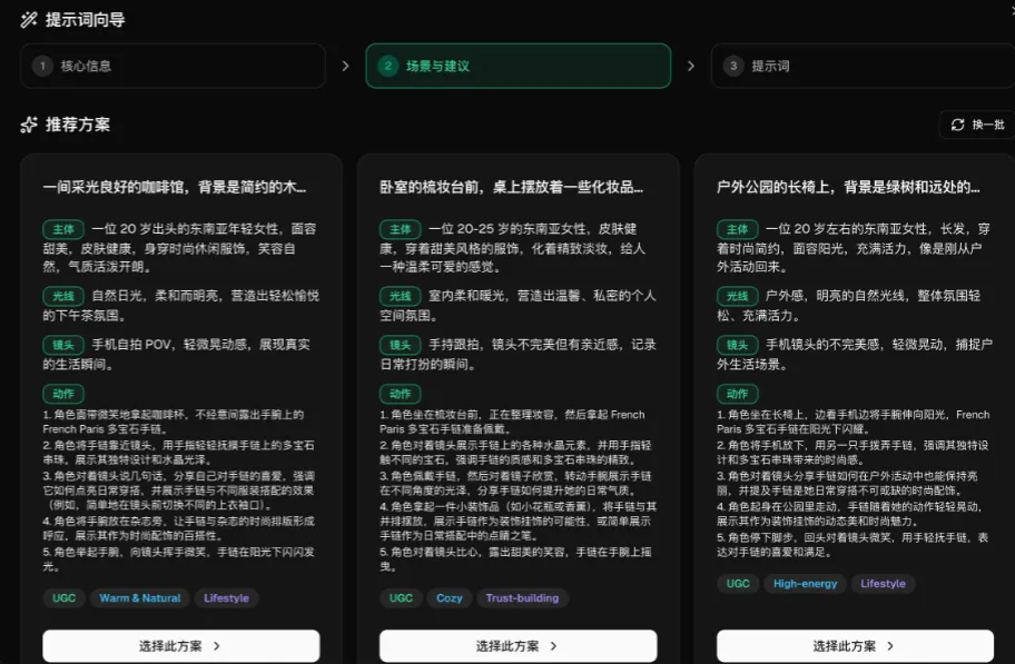1.推荐方案ai会自动生成我们想要的场景描述,客户也可以通过这些语言逻辑去跟前面的视频分析部分交流(轻微晃动感,展示真实的生活瞬间类似的语言学习),进而学习到如何跟用ai程序的语言去做出自己满意的视频。