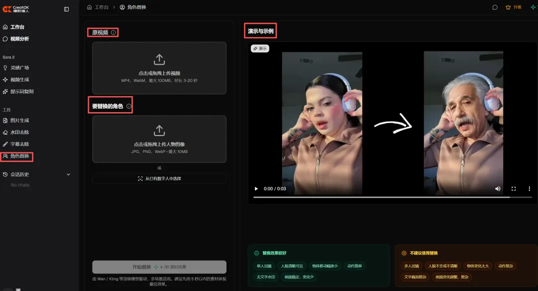 1.角色替换需要目标视频、替换的外模照片具体参考其中使用的全身照数字人。