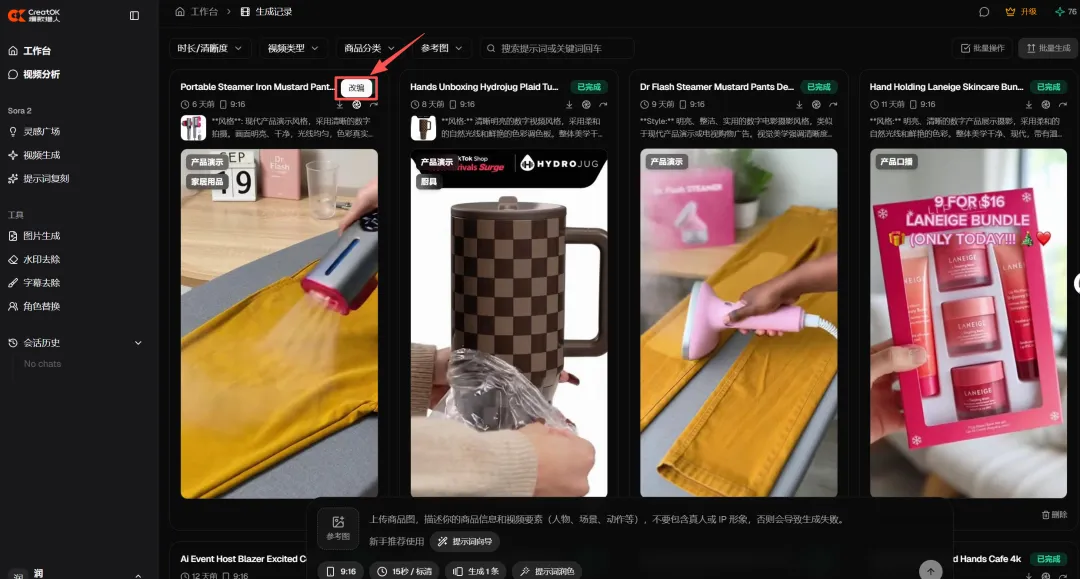 改编功能是对生成的视频进行微调:比如某些产品的细节修复某些语言的微调,删除字幕等等。