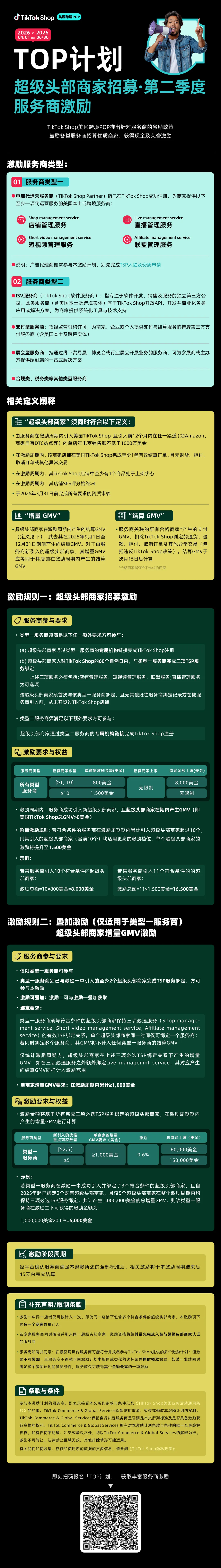 作为“TOP计划”的重要组成部分,本季度激励计划旨在鼓励各类服务商招募超级头部商家入驻TikTok Shop,尤其是那些暂时无法提供联盟管理、短视频等完整代运营服务、但掌握大量优质商家资源的服务商伙伴。依托平台资源与绩效激励,服务商可更高效地招募优质商家,深化合作关系,并将激励反哺商家孵化与成长加速,最终为服务商、商家及TikTok Shop生态创造长期、可持续的价值。