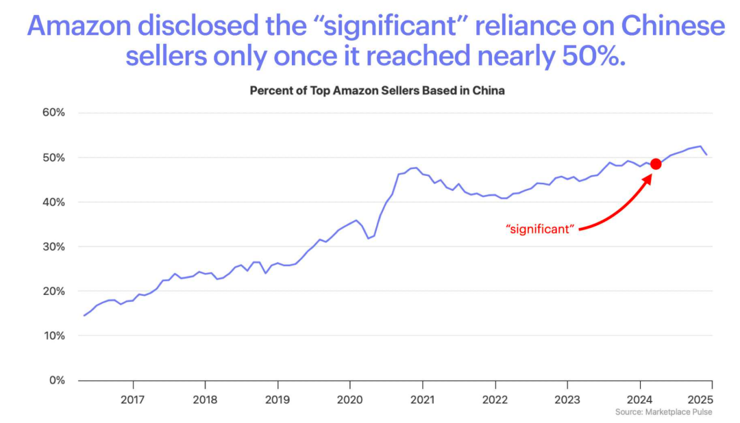 2 月,亚马逊在向美国证券交易委员会提交的年度 10-K 表格中,首次承认了中国卖家在平台的重要地位,并称其“相当可观”。根据 Marketplace Pulse 的研究,中国卖家现在占亚马逊顶级卖家的 50% 以上,美国卖家约占 45%,其余卖家在英国、加拿大或其他国家。