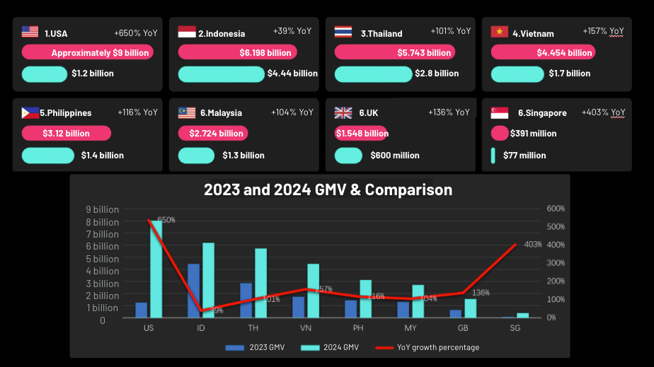 根据视频电商数据分析公司 Tabcut.com 的统计,TikTok Shop 全球 GMV 达到了约 326 亿美元。其中,美国成为 TikTok Shop 最大的市场,GMV 达到约 90 亿美元;印度尼西亚是第二大市场,紧随其后的是泰国。