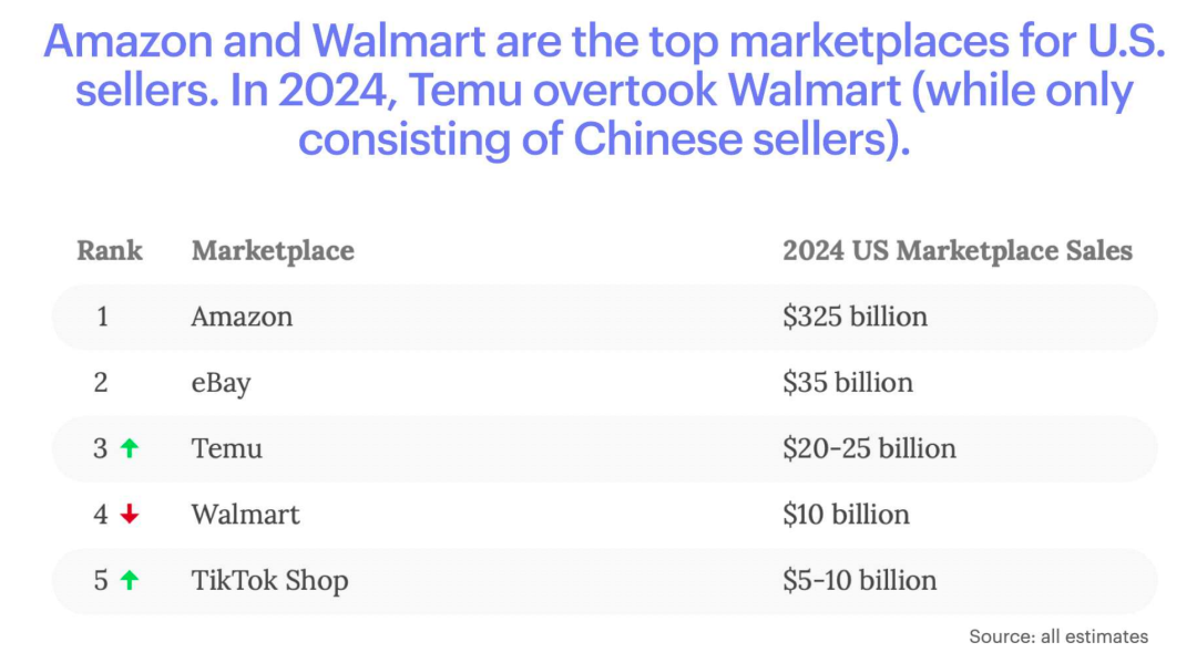 从销售额来看,2024 年,Temu 在美国市场的销售额为 200 亿-250 亿美元,排名第三,已经超越沃尔玛,仅次于亚马逊和 eBay,TikTok Shop 则排名第五。如果两家公司能在美国顺利运营,TEMU 有望在流量超过 eBay 后,在销售额方面也超越 eBay,而 TikTok Shop 则有望超越沃尔玛,两家公司在一步步改变美国电商市场竞争格局。
