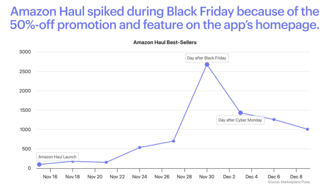 《华尔街日报》援引知情人士的话称,亚马逊开始将 Shein 和 Temu 视为比沃尔玛等零售商更大的威胁。亚马逊 Haul 几乎全面对标 Temu,主打售价低于 20 美元、重量小于 1 磅的白牌商品,旨在吸引那些想要省钱并愿意等待更长时间的消费者。亚马逊 Haul 在黑色星期五期间因 50% 的折扣促销和应用主页的推荐而激增。