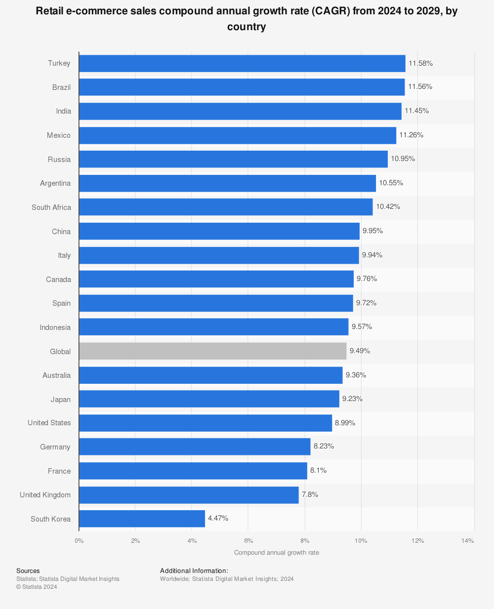 拉美同样如此。根据 Statista 统计,2024-2029 年,预计电商销售额增长最快的五个国家,分别是土耳其、巴西、印度、墨西哥、俄罗斯。其中巴西、墨西哥均属于拉美。