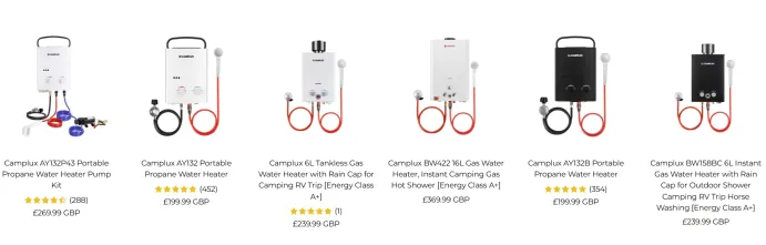 CAMPLUX 产品均价在 199 美元—500 美元之间,其在亚马逊欧美站销量极佳,其首款户外热水器抢占 BSR 榜单前五。