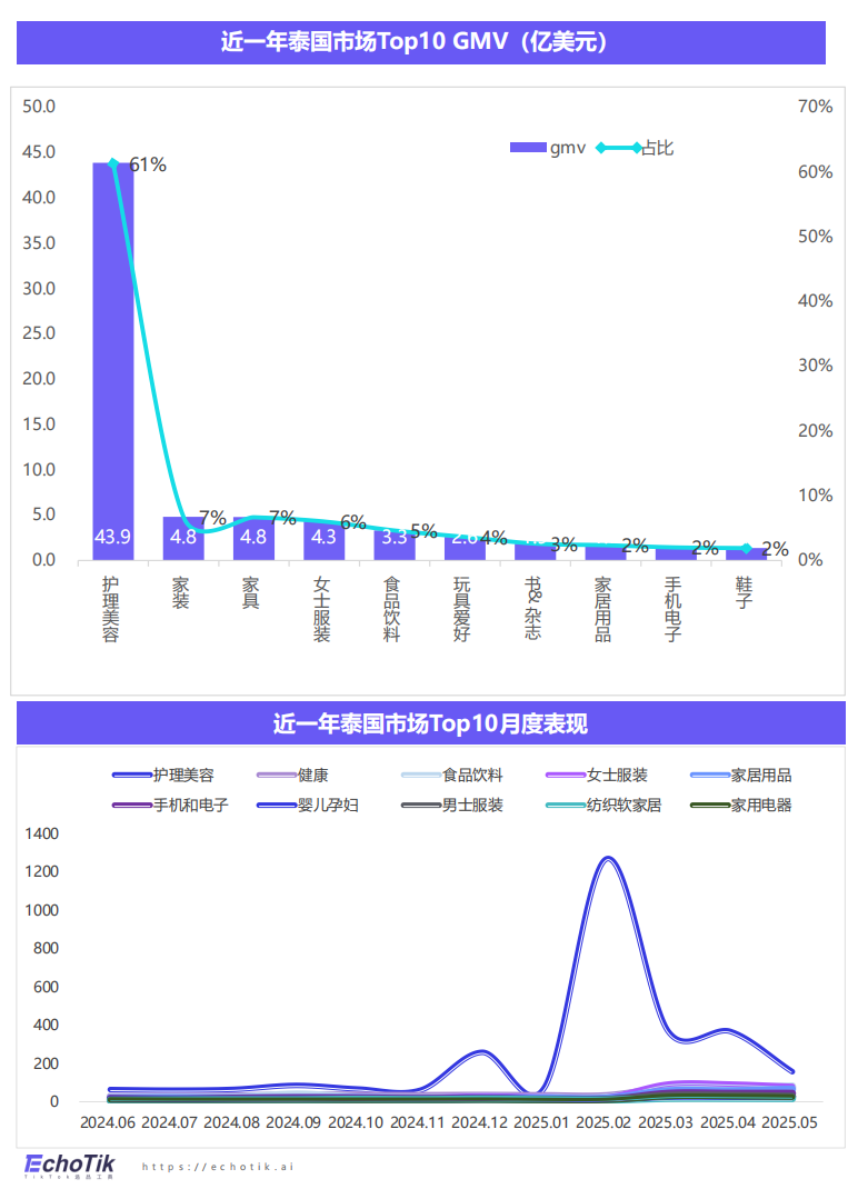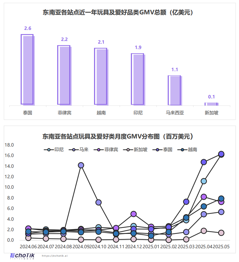 根据 EchoTik 数据,2024年6月–2025年5月期间,东南亚站点TikTok Shop 玩具及爱好品类总GMV已达11亿美元,展现出强劲增长态势。泰国、菲律宾、越南三大站点合计贡献超过50%份额,成为区域市场的核心引擎。