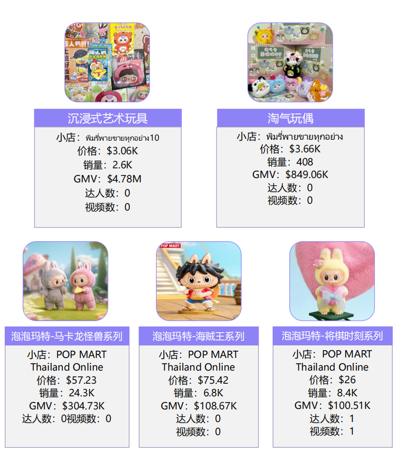 市场呈现寡头化格局,POP MART Thailand Online 凭借Labubu等爆款断层式领先,其销售额超过第二名近5倍。达人带货与拆箱短视频是主流营销方式,形成较成熟的种草转化模式。