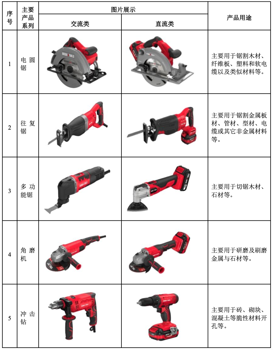开创电气成立于 2015 年 12 月,目前总部位于浙江省金华市。公司主要从事手持式电动工具整机及核心零部件的研发、生产、销售及贸易, 是一家专业的电动工具制造商。公司生产的电动工具系列产品被广泛应用于家庭装修、木材加工、金属加工、 汽车维修、建筑道路等领域。具体产品涵盖电圆锯、往复锯、多功能锯、角磨机、曲线锯、电钻、电扳手等多个品类及电池包、注塑箱等配件,按供电电源不同,又分为交流和直流两大系列。以下为部分产品等展示: