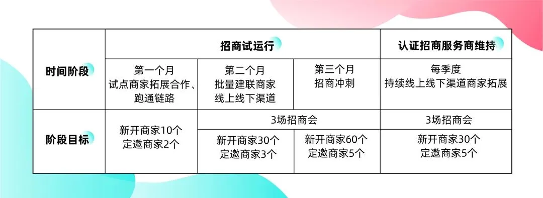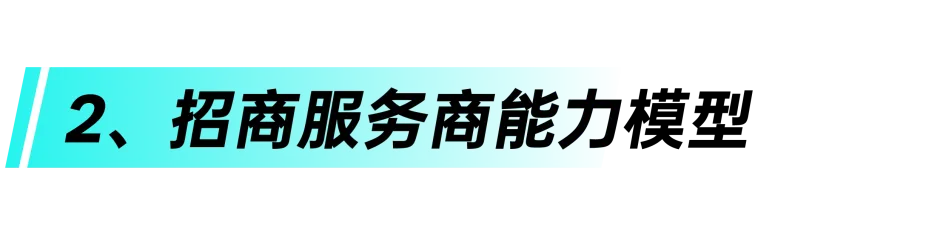 目前招商服务商生态服务贯穿从招商到孵化各个阶段,分为商家招募、商家识别、基建指导、社群答疑、商家培训、店铺诊断、供应链分销、代运营等8个能力项,由浅入深,从招商服务商到招孵一体服务商能力进阶。