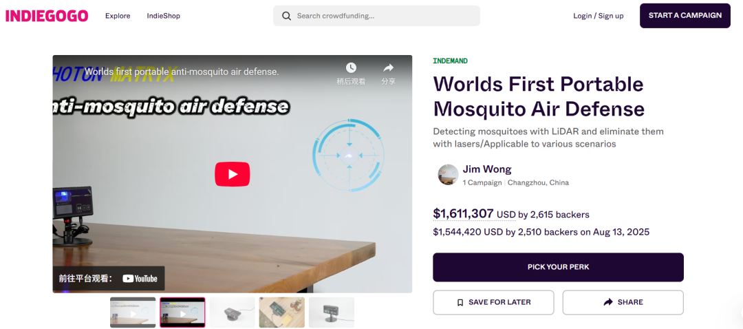 而近期,一款由中国工程师团队打造的高科技灭蚊装置 Photon Matrix(光子矩阵),却意外在海外引爆关注。在 Indiegogo 平台上线不到几周,众筹金额突破 143 万美元,并登上 Indiegogo 首页第一屏轮播图,成为本月平台重点推荐的爆款项目之一。