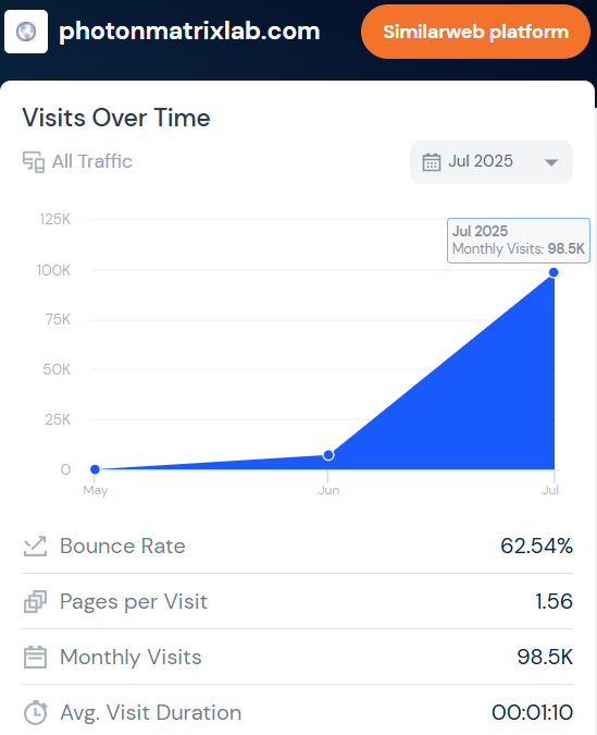 不仅是短视频平台带来流量暴涨,官方网站访问数据也体现出极强的市场关注度。根据数据监测显示,Photon Matrix官网(https://photonmatrixlab.com/)自 6 月以来访问量从7300次跃升至 9.85 万次,短期内涨幅高达 1249%,其中美国用户占比近 70%,这说明海外用户对这款产品的接受度与兴趣正在快速提升。