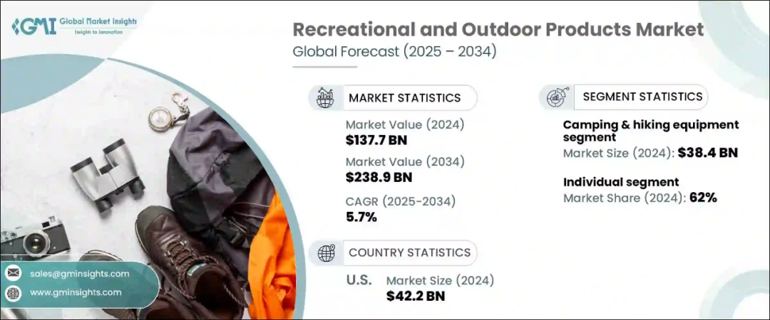 2024 年,全球休闲户外用品市场规模达 1377 亿美元,预计 2025 年至 2034 年的复合年增长率将超过 5.7%。