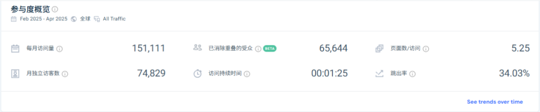 独立站:每月访问量为 15 万次,月独立访客数为 74829,页面数/访问为 5.25,访问持续时间为 1 分 25 秒,跳出率为 34.03%。用户在网站上的参与度较高,用户在网站上停留的时间较长,且跳出率相对较低,说明用户对网站内容的兴趣较高。