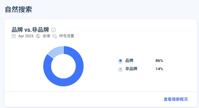 在自然搜索中,品牌搜索占比为 86%,非品牌搜索占比为 14%。这表明品牌知名度较高,用户更倾向于通过品牌名称进行搜索。