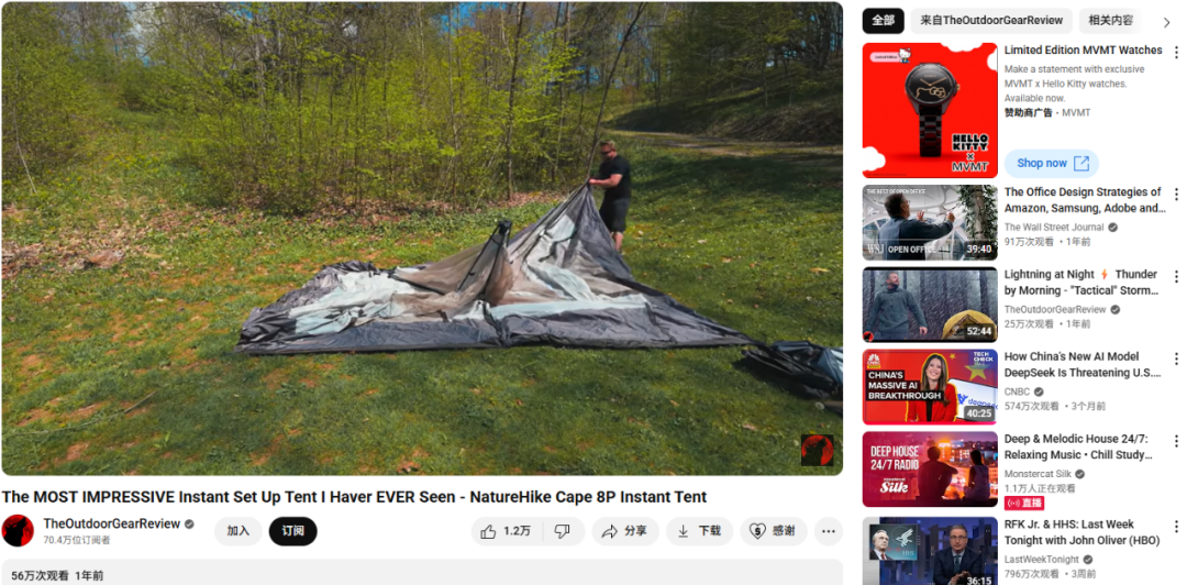 TikTok 与 YouTube 是户外品牌推广的重要平台,品牌还与 TheOutdoorGearReview 等垂直频道合作,借助其深度测评来建立信任,例如展示“8 人速搭帐篷”的视频,获得了 56 万次播放量,直接拉动了亚马逊销量增长。