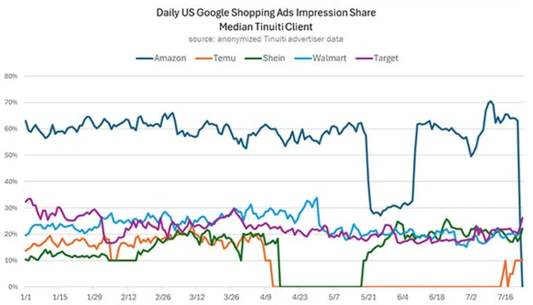 另一方面则是近期正值亚马逊减少广告投入的窗口期,平台得以抢占流量高地。AMZ123 在此前文章曾提到,亚马逊7月在包括美国市场在内的全球多个市场撤下了谷歌购物广告,释放了大量的高质量广告位,为 Temu 提供了扩大广告展示份额的机会,形成了短期协同利好。