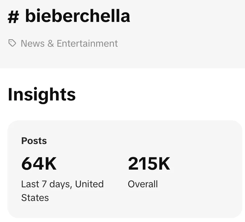 先来简单看一下目前这个高热度现象的背景:比伯此次表演舞台的官方视频播放量高达1.4亿次,创下Coachella历史最高纪录;Bieberchella关键词2周内在TikTok收获了21万+的讨论。如此盛景不是一个简单的巨星效应就能概括的。