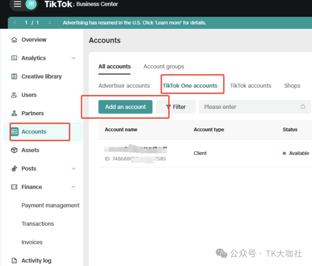 3、进入TikTok One创建账户。