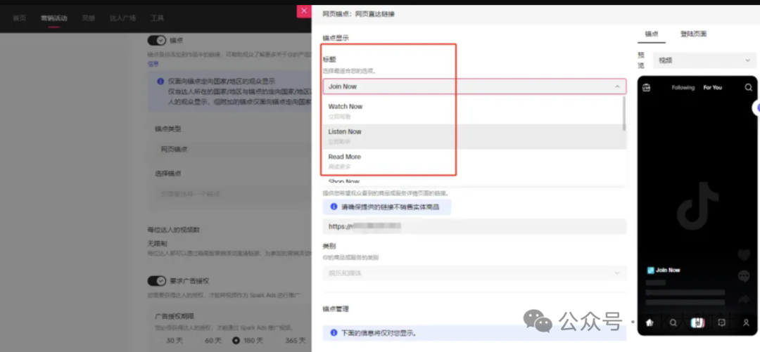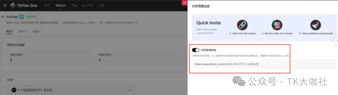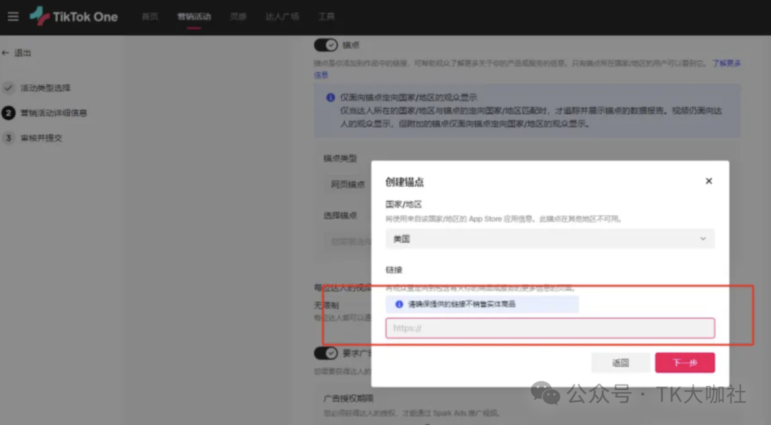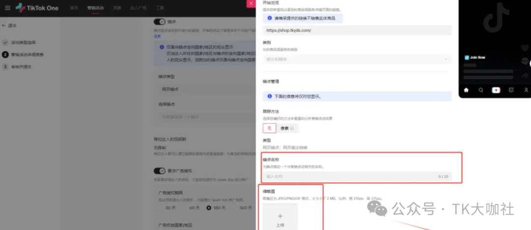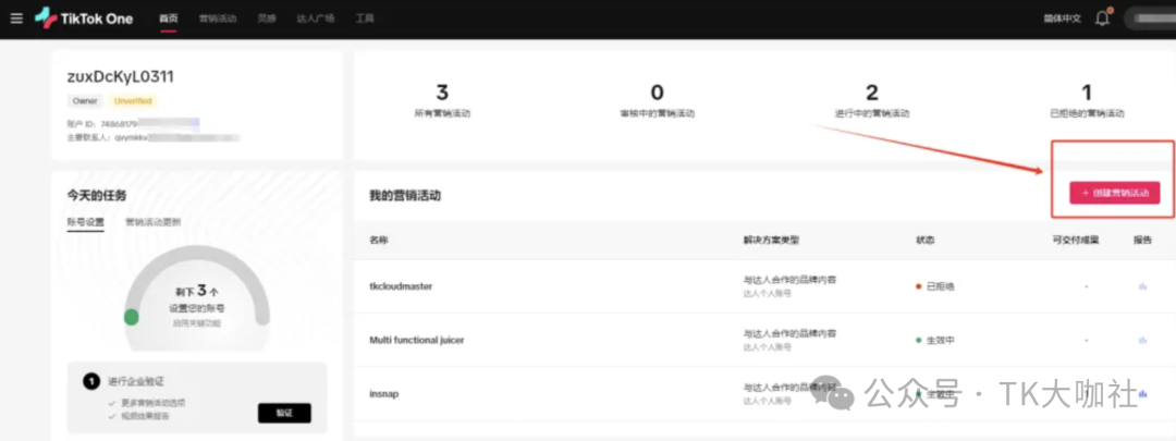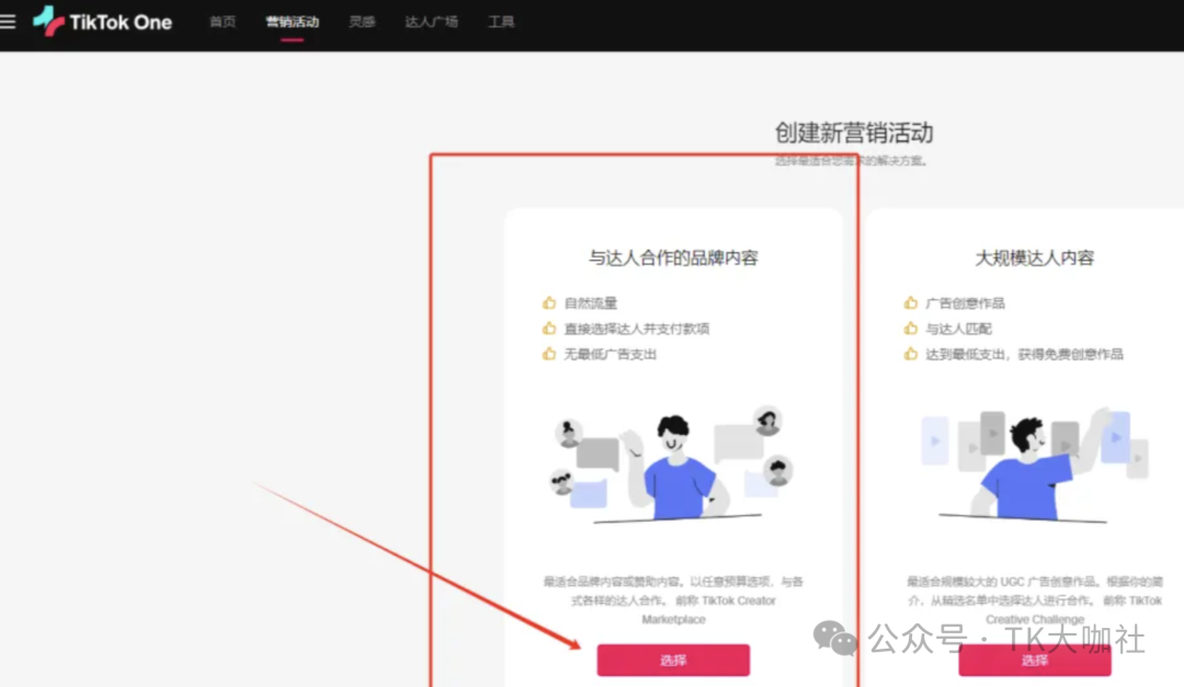 1、用最新的TikTok One后台创建营销活动,利用营销活动可以填报外链的属性实现带货。
