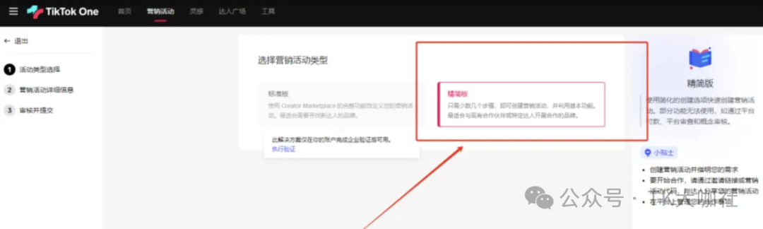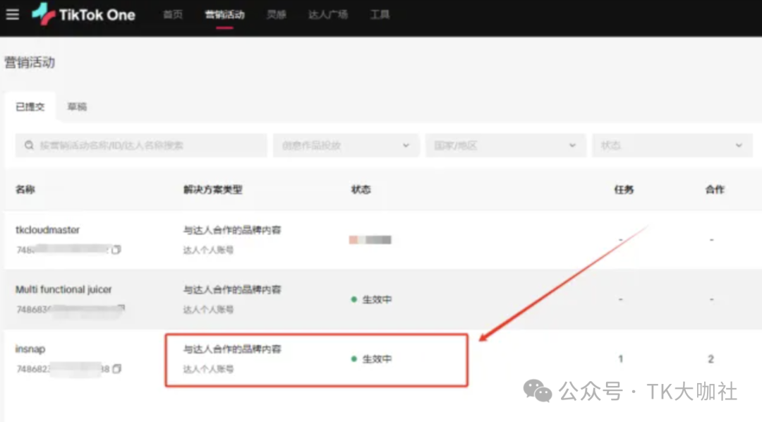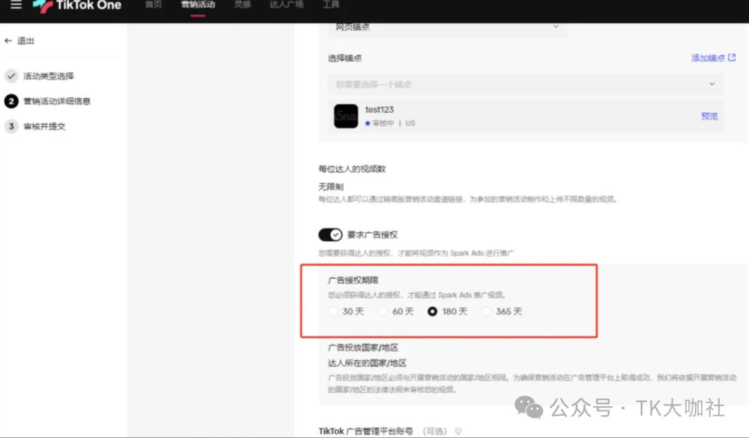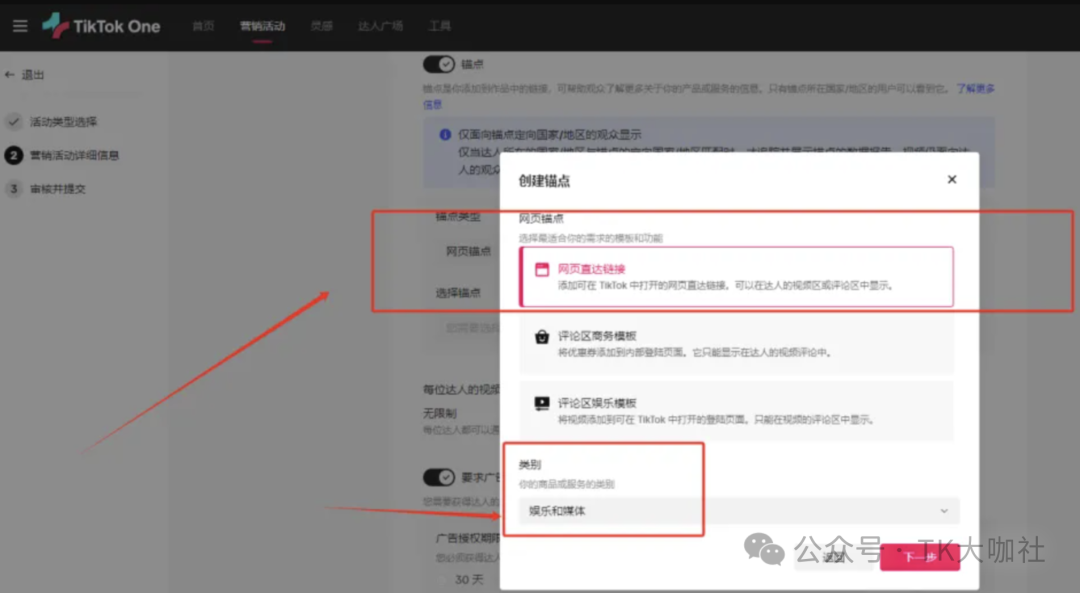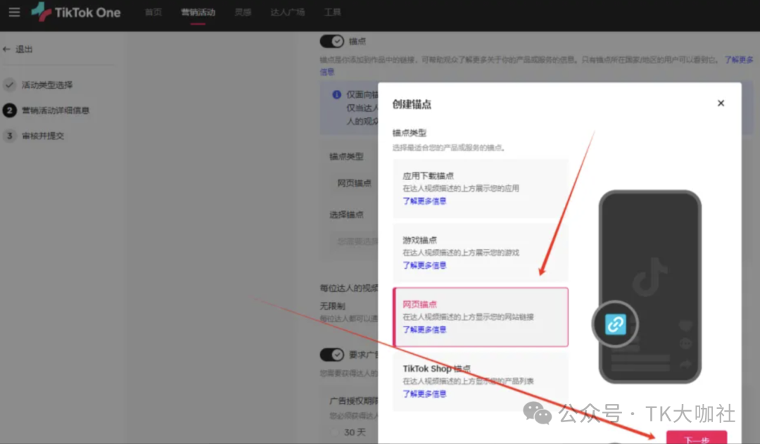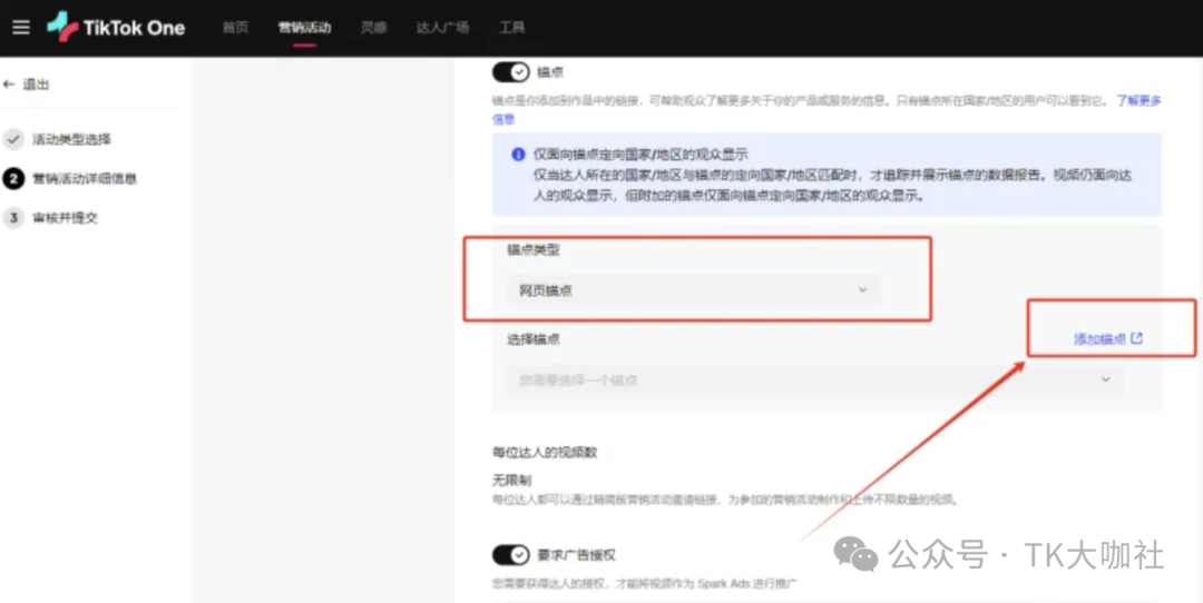 1、用最新的TikTok One后台创建营销活动,利用营销活动可以填报外链的属性实现带货。