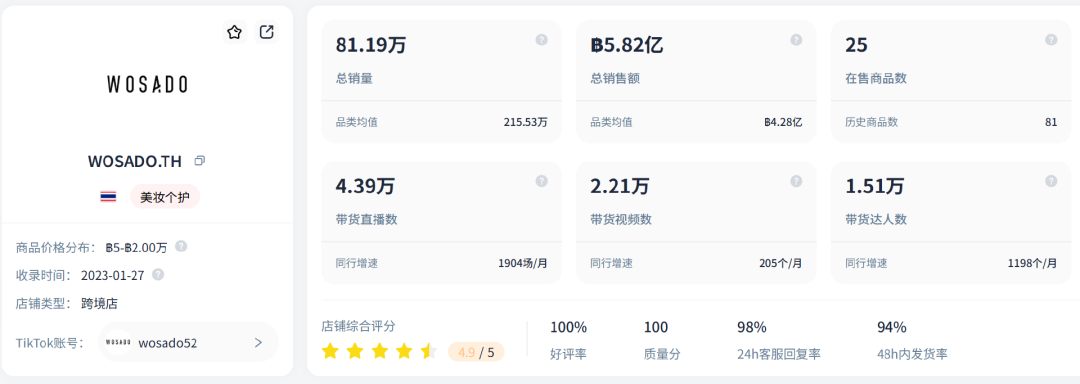 尤其是在泰国市场,WOSADO 表现最为突出,Fastmoss 数据显示,截至今年 5 月 8 日,WOSADO 在 TikTok 泰国站的总销售额已达 5.82 亿泰铢(约合 1.28 亿元人民币)。