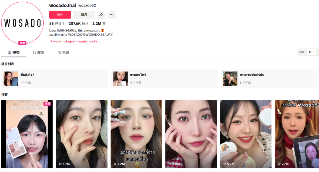 考虑到不同地区消费者在眼妆偏好与审美上存在差异,为了更精准地触达垂直用户,WOSADO 在同一平台设置多个账号,每个账号专门发布针对当地市场的视频内容,这种精细化运营让品牌内容更具针对性和亲和力。