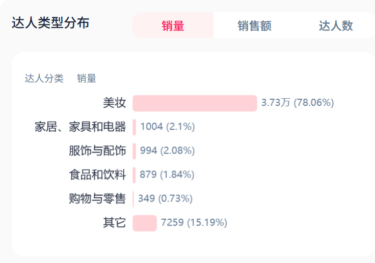 而数据表明,美妆垂直类目的达人与 WOSADO 品牌的适配性更强,近 28 天销量达 3.73 万单,占比 78.06%。