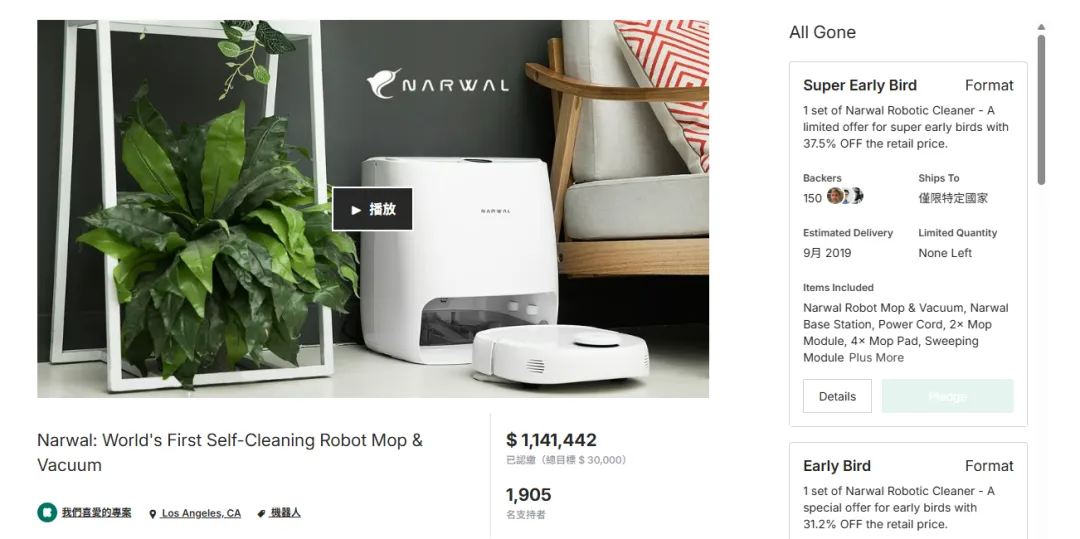 2019年4月16日,云鲸在Kickstarter上线项目“Narwal: World's First Self-Cleaning Robot Mop & Vacuum”,没有喊“低价”口号,反而用一套“差异化叙事+精准运营”,创下了行业经典案例: