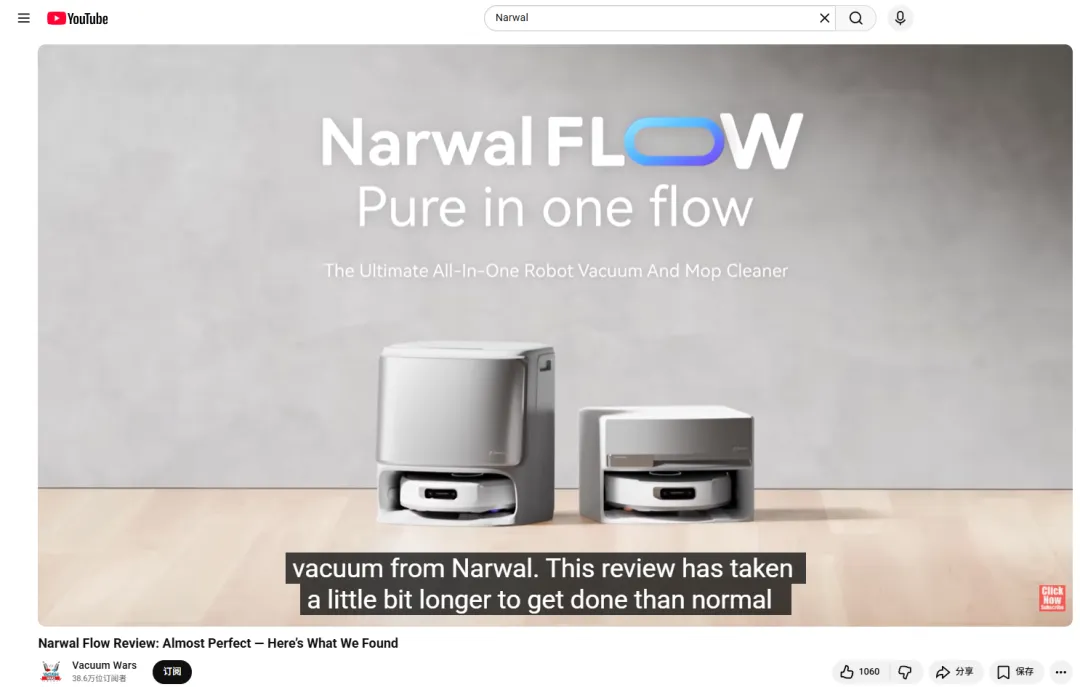 YouTube:专业测评+信任背书,聚焦25-34岁男性科技消费群体(占比45.09%),美国粉丝占比超80%,合作垂直清洁测评博主@VacuumWars(38.5万粉丝),对Narwal Flow进行数周深度测评。