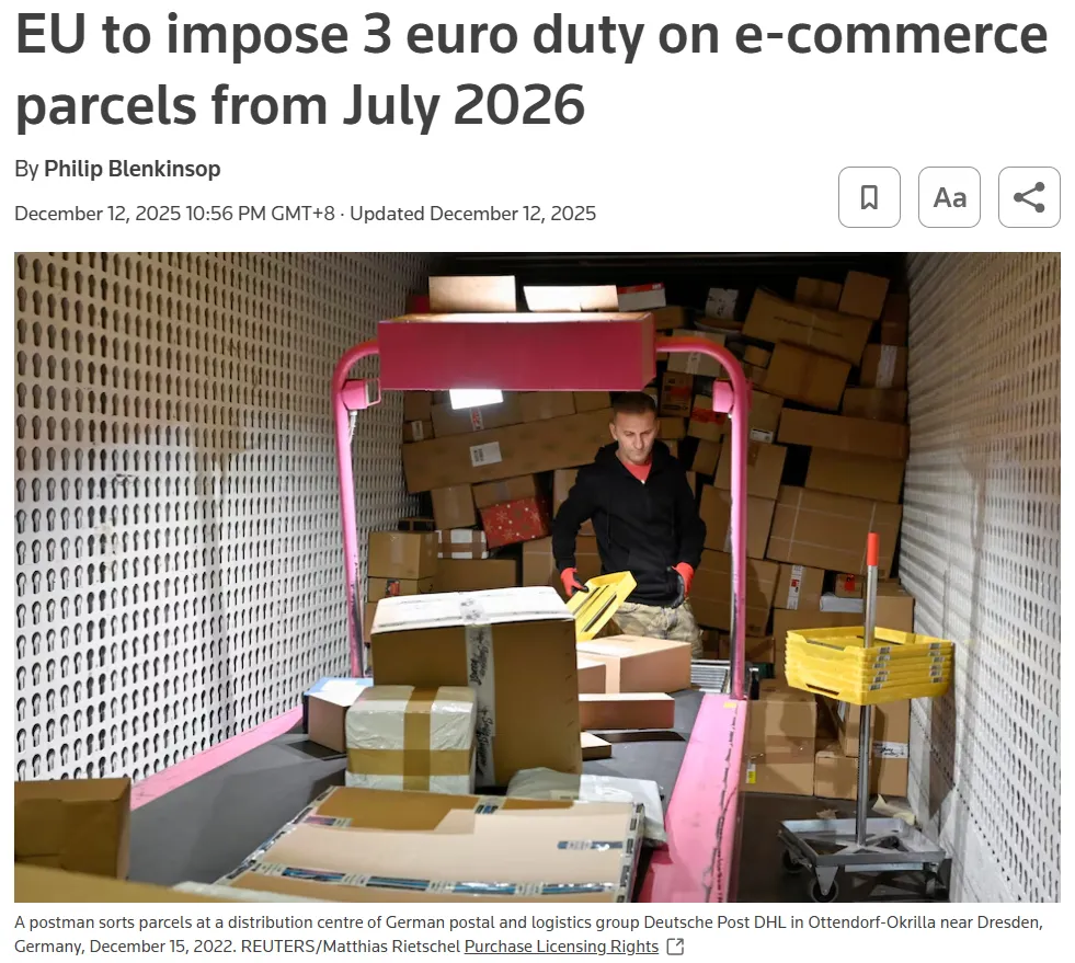 ·2025 年 12 月:最终敲定关税金额提升至 3 欧元 / 件,并明确 2026 年 7 月的实施时间。短短半年内,政策从 “提议收费” 到 “提额 + 提前取消免税”,足见欧盟整治小额包裹乱象的决心。