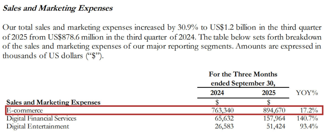 据财报,Sea 总销售和营销费用在 2025 年第三季度增长了 30.9%,达 12 亿美元。其中,电商业务的销售与营销支出不仅保持同比两位数增长,还占据集团总销售和营销费用的过半比重,达 74.55%。