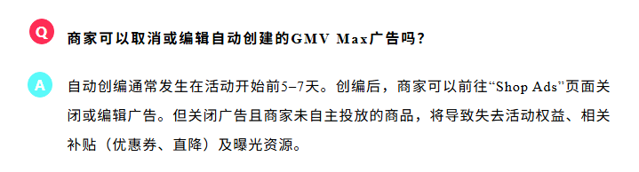 “创编后,商家可以前往“Shop Ads”页面关闭或编辑广告。但关闭广告且商家未自主投放的商品,将导致失去活动权益、相关补贴(优惠券、直降)及曝光资源。”