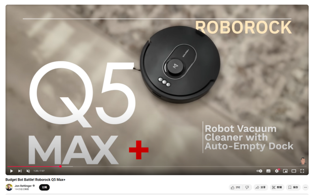 例如,科技博主 Jon Rettinger 发布了一条视频,深入对比了 Roborock Q5 与 iRobot Roomba i3+,从吸力、智能导航到性价比多个维度展开测评,帮助观众明确真实需求,理性做出购买决策。