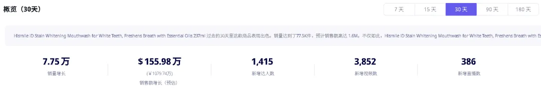 据 EchoTik 平台数据显示,过去 30 天(3.1-3.30),这款漱口水共售出了 7.75 万件,销售额达到了 155.98 万美元(折合人民币约 1079.74 万元),成为 2026 年以来 TikTok 美区口腔护理赛道当之无愧的现象级单品。