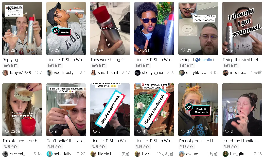如果说产品力是 Hismile 漱口水的根基,那么 TikTok 独有的视觉驱动内容生态则是其实现快速破圈的核心引擎。作为 Hismile 的主战场,品牌早已吃透 TikTok 的流量逻辑:用真实的视觉对比,制造强烈的传播冲击力,这一内容思路在漱口水的推广中被运用到了极致。