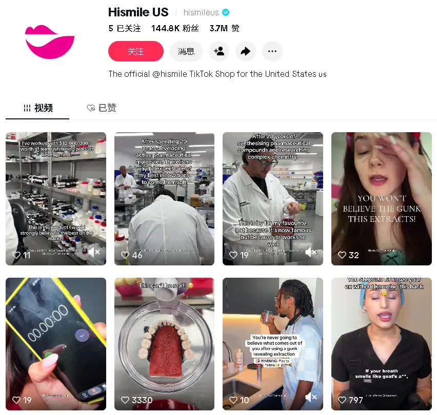 在达人策略之外,品牌的官方账号也起到了放大器的作用。TikTok 官方账号 @hismileus 目前累计粉丝 14.48 万,获赞 370 万,自产品上线以来,品牌 TikTok 账号为美白漱口水累计产出了 70 条带货视频,带货 GMV 达到 29.67 万美元,位居带货账号榜首。