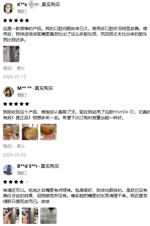 不过,这种强视觉效果也天然伴随着争议。围绕这款产品,有人质疑这些吐出来的“污垢”并非真的来自于口腔,更有可能是配方成分发生反应带来的视觉效果。从产品评论区的反馈来看,多数用户认可产品带来的清洁感、新鲜感和使用过程的冲击体验,而立竿见影的美白并没有形成一致认知。但从某种程度上,用户的讨论、质疑和二次验证,也会进一步为产品带来曝光。
