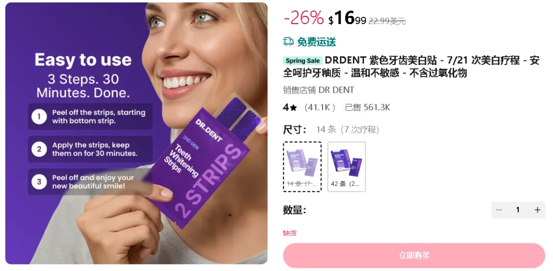 Hismile 自家的 V34 紫色美白牙贴是店铺排名第二的销售单品,近 30 天售出 1.22 万单;而 2025 年 11 月上线的 DRDENT 紫色美白牙贴,也是凭借即时视觉校正原理在 TikTok 美区热卖。该产品采用无过氧化物温和配方,通过紫色中和黄色的原理,在短时间内让牙齿看起来更白,哪怕这种效果并非深层次美白,但在短视频环境里,它依然具备极强的传播力。搭配 16.99 美元/盒的高性价比定价,上架后迅速成为 TikTok 美区美妆个护销量头部单品,近 30 天卖出了 16.12 万单,16.99 美元 14 条装的规格一度卖到断货。