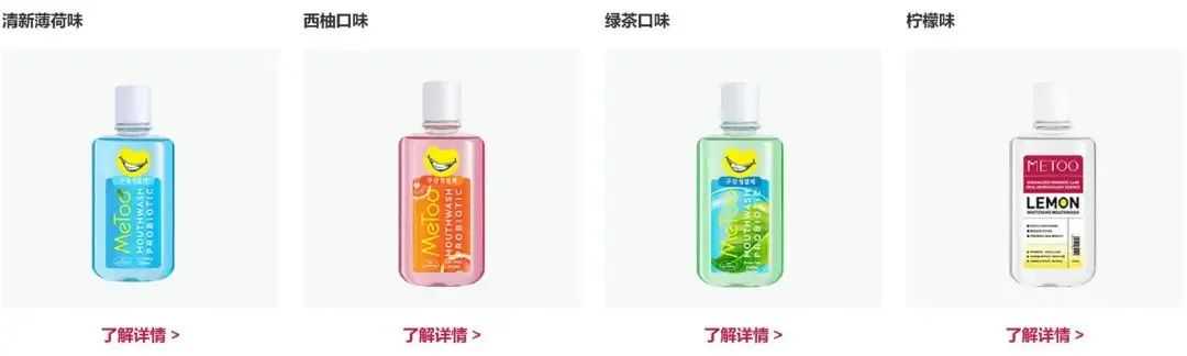 针对年轻化产品缺失的问题,Metoo 创新式地提出了益生菌漱口水的概念。不仅在成分上与传统漱口水形成区分,更符合时尚健康的潮流,口感上也趋于多元化,包含薄荷、西柚、绿茶、柠檬等口味,给人以清新舒适的味蕾体验。