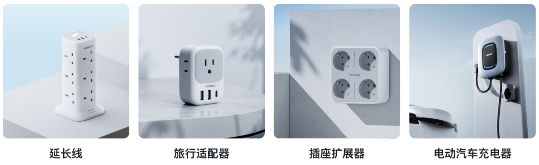 此后,Tessan 增加了多口充电排插、多设备同时充电的插座,以及电动汽车充电器等,其产品应用逐渐覆盖到旅行、家用、办公等场景。