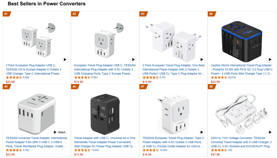 而这种打法带来的结果,直接反馈到了类目的 BestSeller 榜单上。在 Power Converters 类目下,仅 Tessan 的产品就占了 7 个席位。